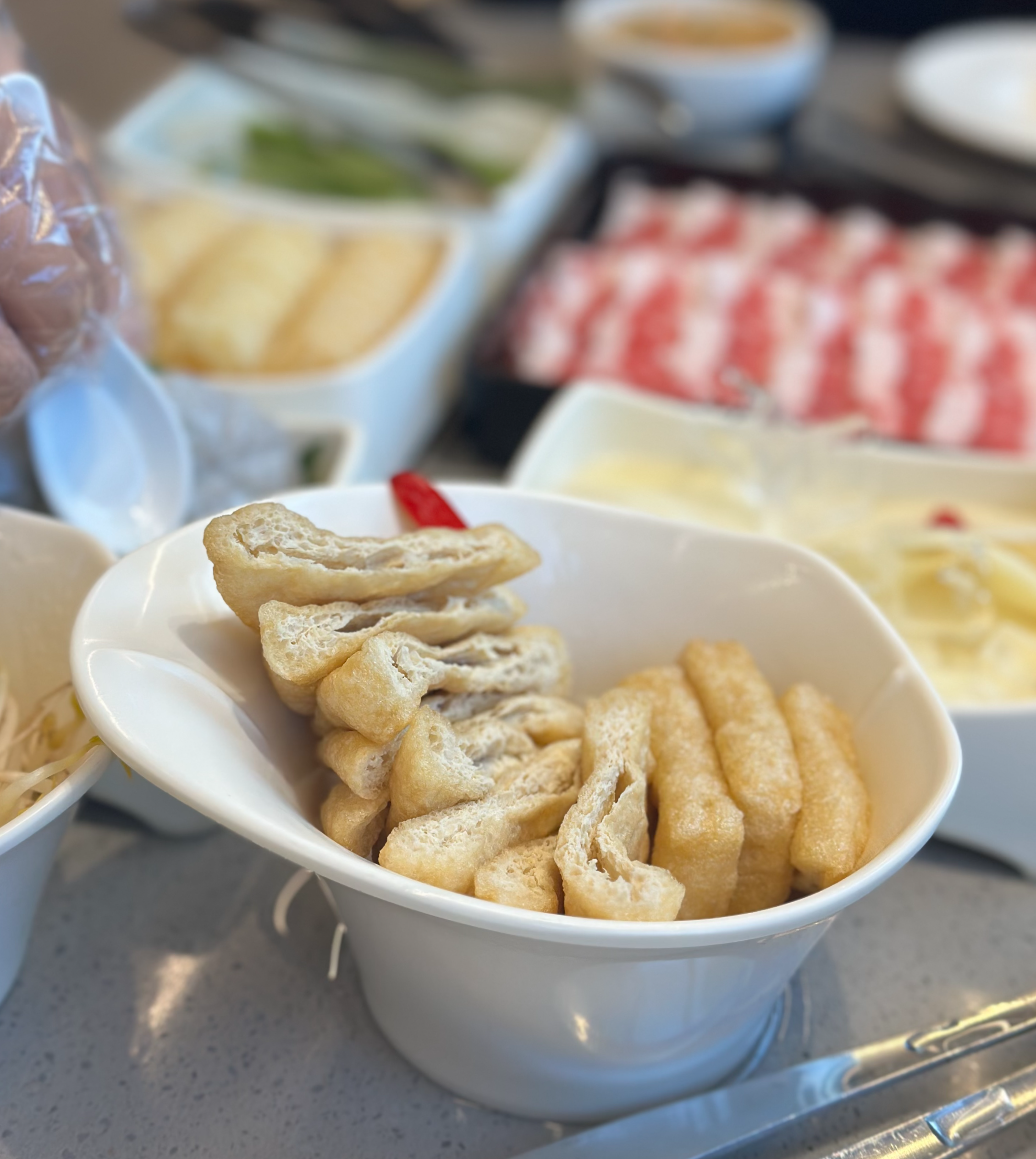 ✅ 재료 중 두유피튀김을 시키셔서 먹고자 하는 훠궈탕에 넣고 두유피튀김을 살살 풀어서 개인 접시에 올린 뒤 긴 우삼겹류 고기를 넣어 다시 말고 훠궈탕에 넣어 고기를 익힌 후 먹으면 보들보들하니 맛있습니다.